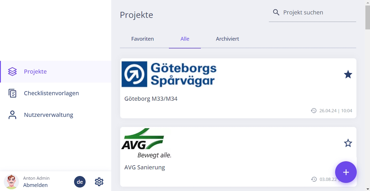 Nach dem Login gelangen Sie direkt zur Projektübersicht im Bereich „Projekte“.