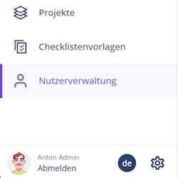 Admin: Kann Nutzer anlegen, bearbeiten, deaktivieren/löschen sowie Nutzern Projekte zuweisen.