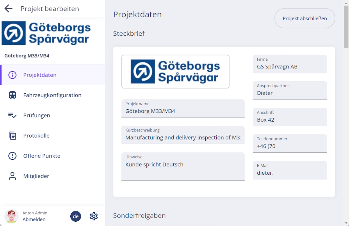 In den Projektdaten finden Sie Projektinformationen wie Kurzbeschreibung, Hinweise, Ansprechpartner und Sie können Sonderfreigaben verwalten. Diese Hinweise können für den Prüfer in der Prüfungs-App vor Ort relevant sein.