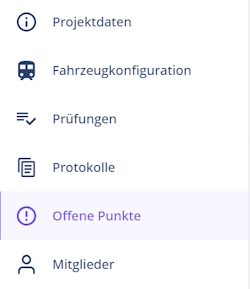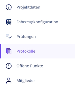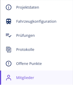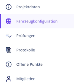 Links wird die Projekt-Sidebar sichtbar, über die alle weiteren Bereiche aufgerufen werden können, um ein Projekt zu bearbeiten: Projektdaten, Fahrzeugkonfiguration, Prüfungen, Protokolle, Offene Punkte, Mitglieder.
