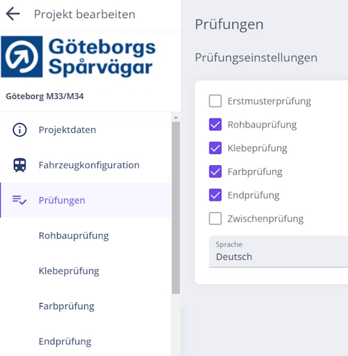 Für die Prüfungstypen Rohbau-, Klebe- und Farbprüfungen ist es möglich mehrere Sichtprüfungen anzulegen und verschiedene Sprachen für den Normenkatalog festzulegen.