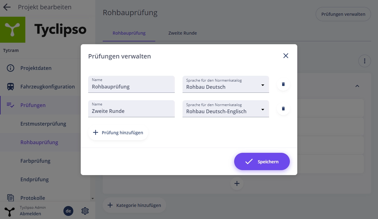 Über Prüfung hinzufügen legen Sie nacheinander alle Prüfungen an und legen gleichzeitig deren Sprache für den Normenkatalog fest.