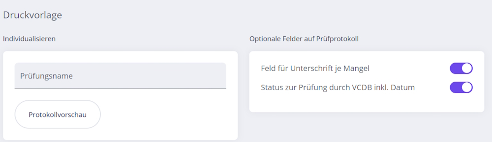 Unterhalb der Checklisten können Einstellungen für die Druckvorlagen für die Protokolle erstellt werden.